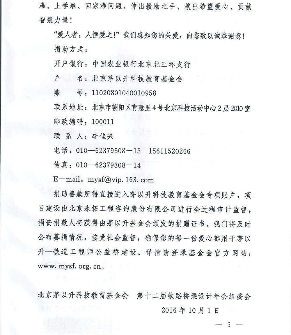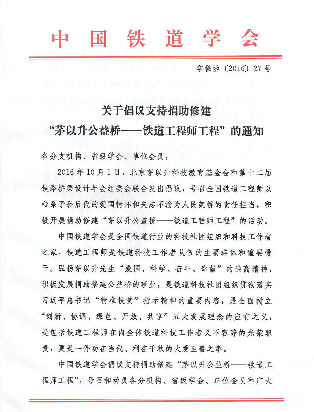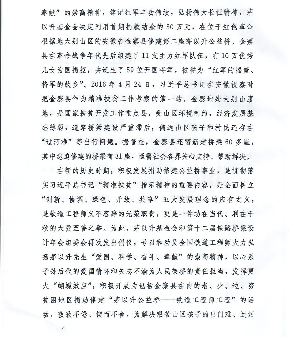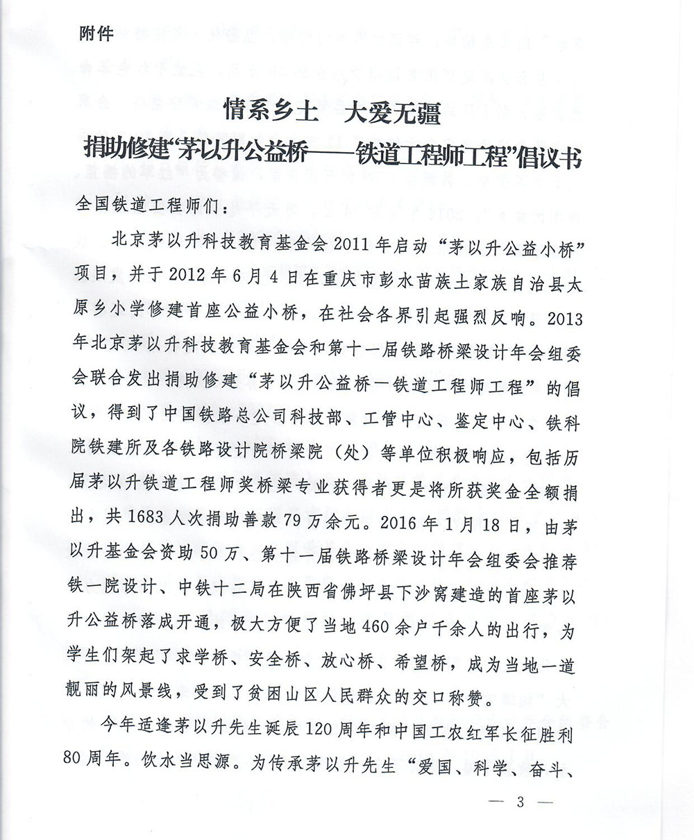 关于倡议支持捐助修建"茅以升公益桥——铁道工程师工程"的通知